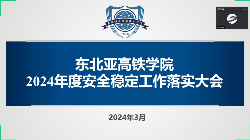 为进一步贯彻落实学校2024年安全稳定工作大会会议精神,东北亚高铁学院(国际交流中心)于3月13日召开全院线上安全稳定工作落实大会。全体教职工参加会议,会议由院长段金辉主持。