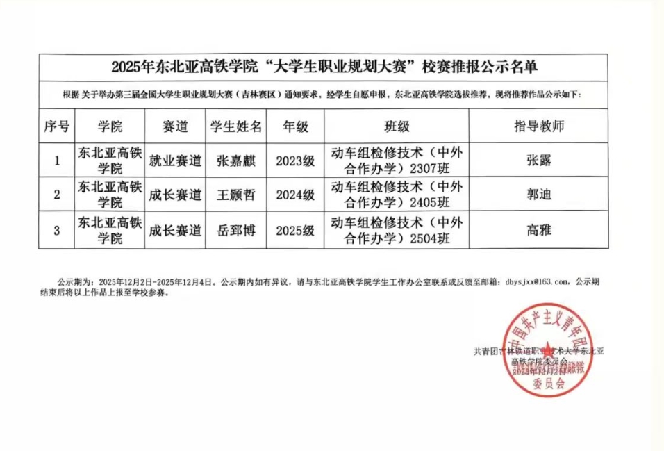 根据《关于举办第三届全国大学生职业职业规划大赛(吉林赛区)通知》要求,学院按照赛制组织了2025年东北亚高铁学院“大学生职业规划大赛”作品竞赛。通过学生自愿申报、组织评审组评审,根据评审意见,拟推报3个项目参加校赛,现予以公示: